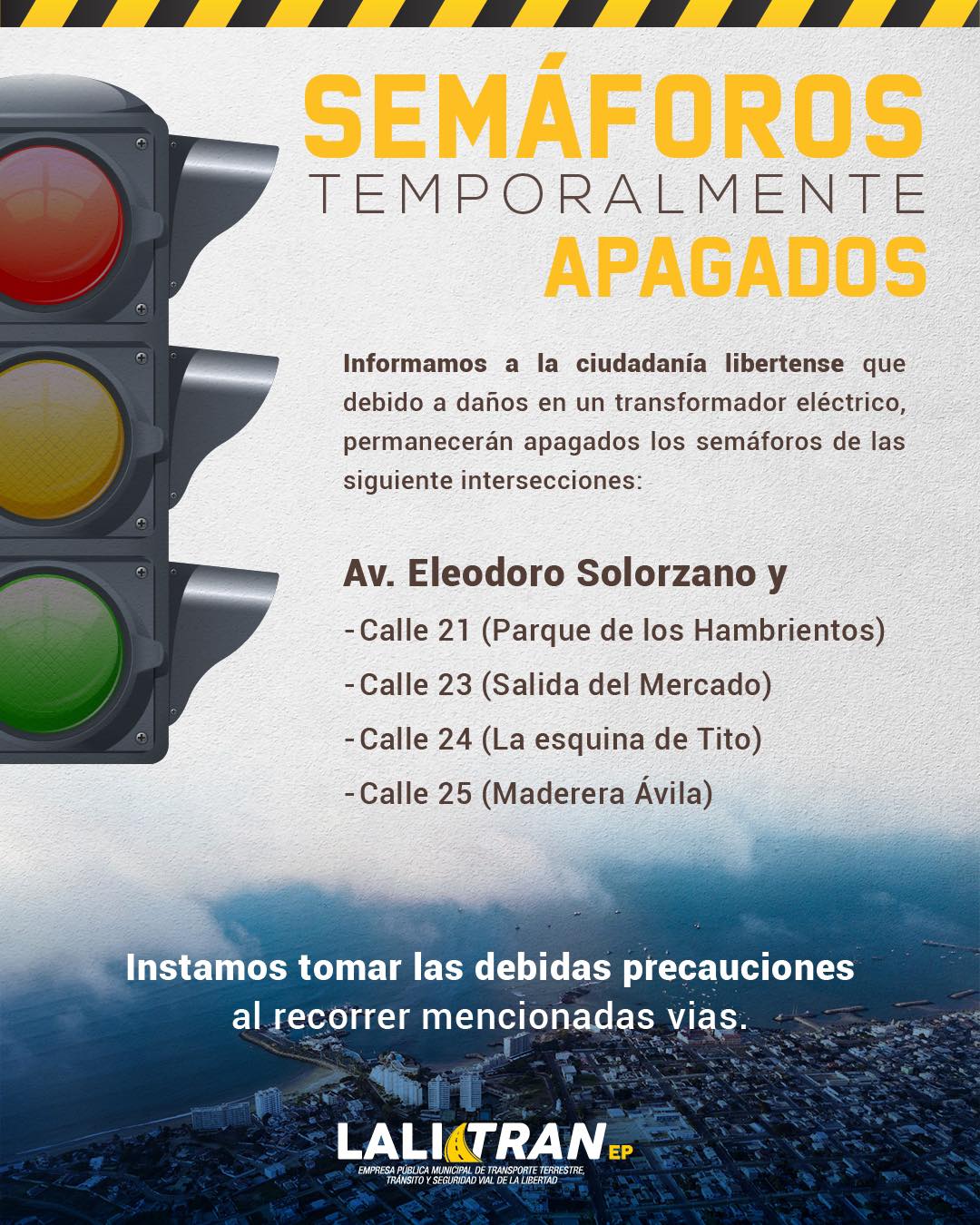 Informamos a la ciudadania libertense que debido a daños en un transformador eléctrico, permanecerán apagados los semáforos de las siguiente intersecciones: Av. Eleodoro Solorzano y -Calle 21 (Parque de los Hambrientos) – Calle 23 (Salida del Mercado) -Calle 24 (La esquina de Tito) – Calle 25 (Maderera Ávila) Instamos tomar las debidas precauciones al recorrer […]
