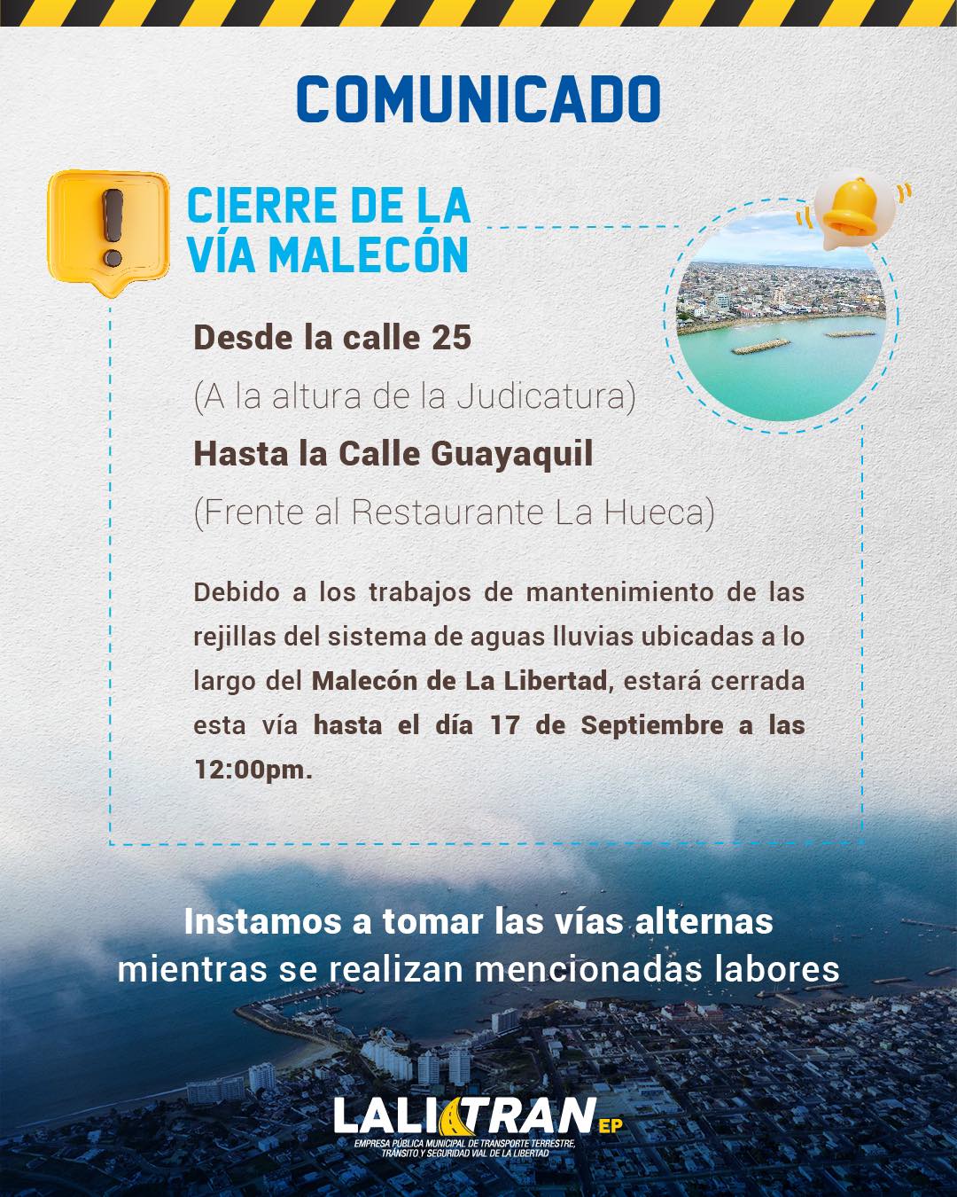 Debido a trabajos de mantenimiento de las rejillas del sistema de aguas lluvias ubicadas a lo largo del Malecón de La Libertad, estará cerrada esta vía hasta el día 17 de Septiembre a las 12:00pm.