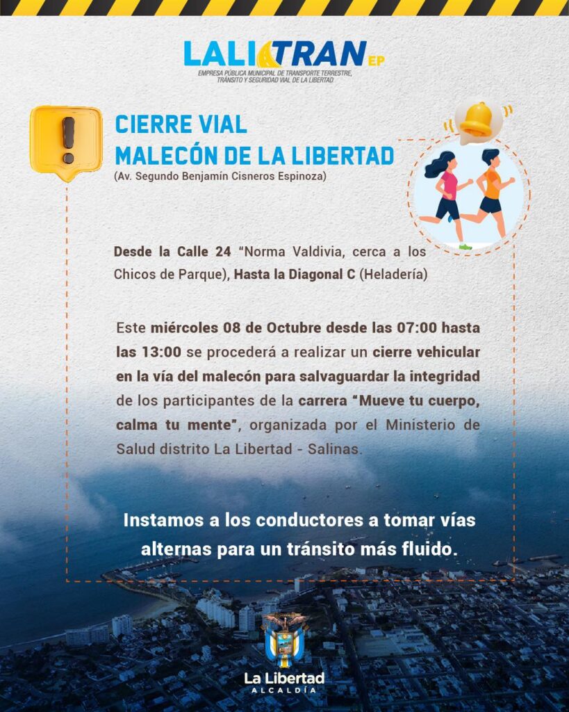 Este míercoles 08 de Octubre desde las 07:00 hasta las 13:00 se procederá a realizar un cierre vehicular en la vía del malecón para salvaguardar la integridad de los participantes de la carrera “Mueve tu cuerpo, calma tu mente”, organizada por el Ministerio de Salud distrito La Libertad – Salinas.