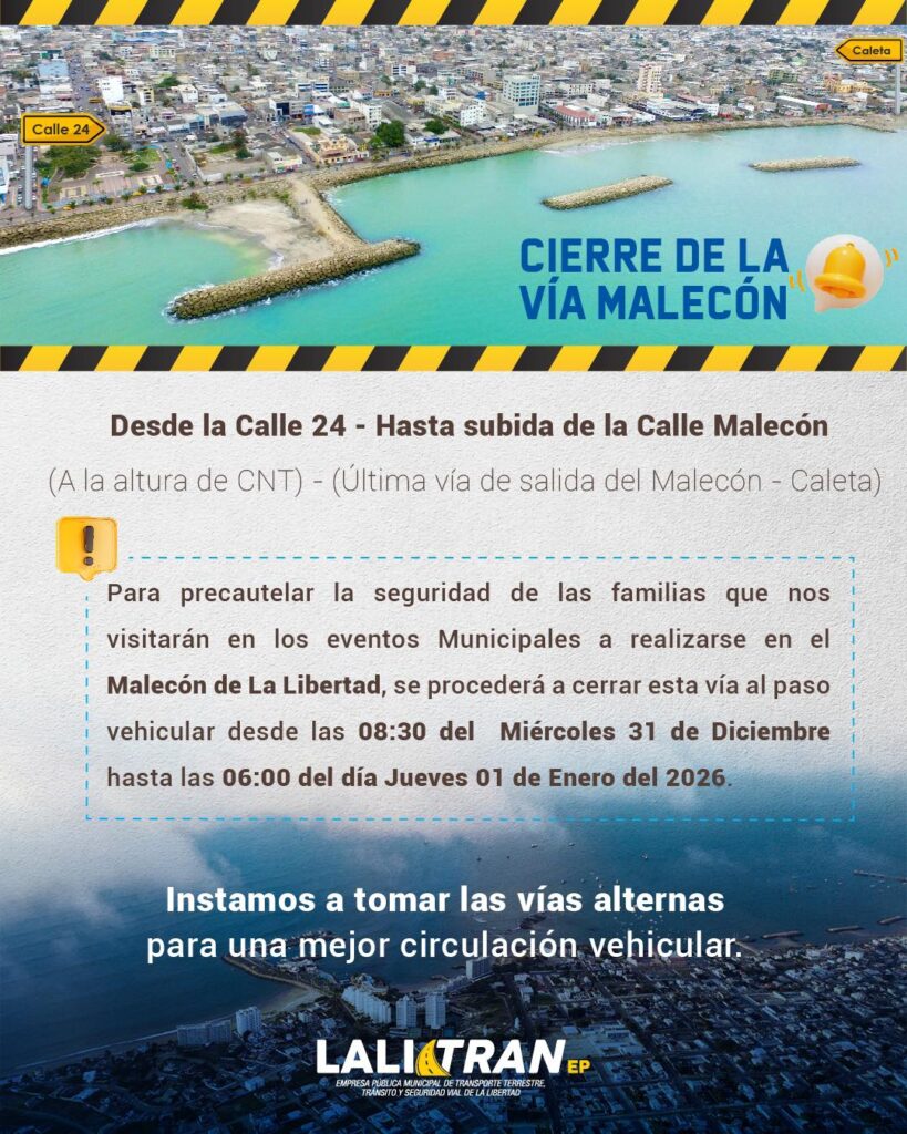 Para precautelar la seguridad de las familias que nos visitarán en los eventos Municipales a realizarse en el Malecón de La Libertad, se procederá a cerrar la vía Malecón desde la Calle 24 (a lado de CNT) hasta la última subida del mismo (La Caleta).