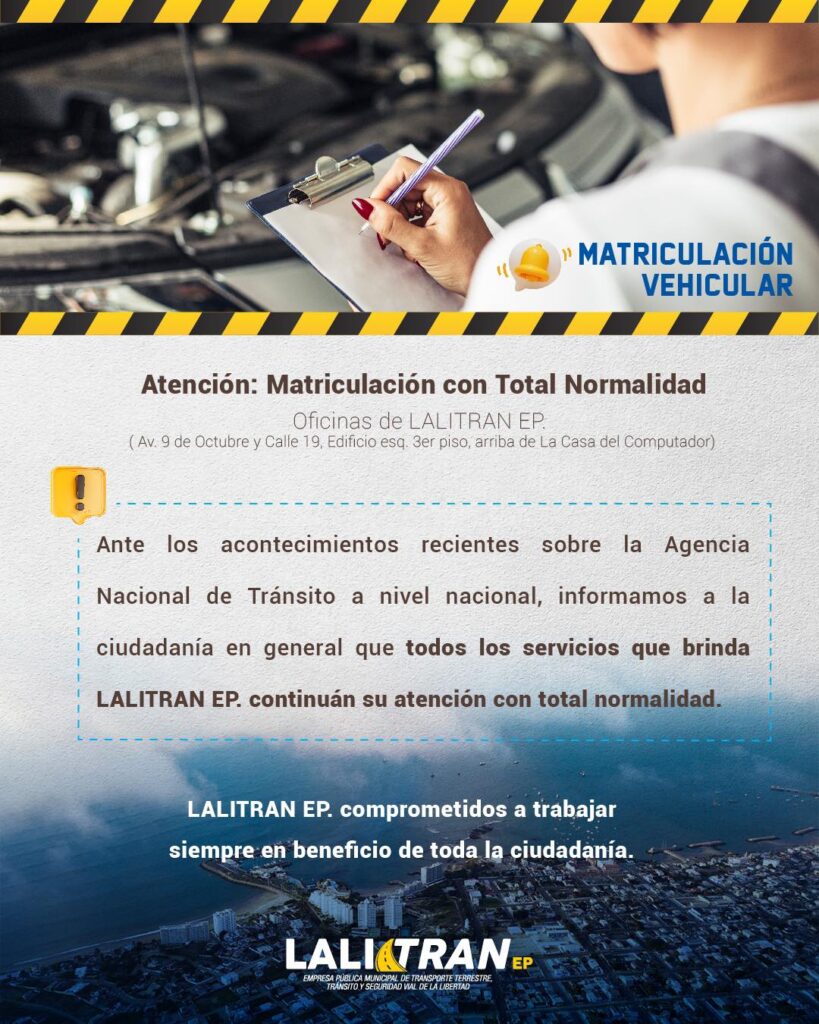 Ante los acontecimientos recientes sobre la Agencia Nacional de Transito a nivel nacional, informamos a la ciudadanía en general que todos los servicios que brinda LALITRAN EP. continúan su atención con total normalidad.