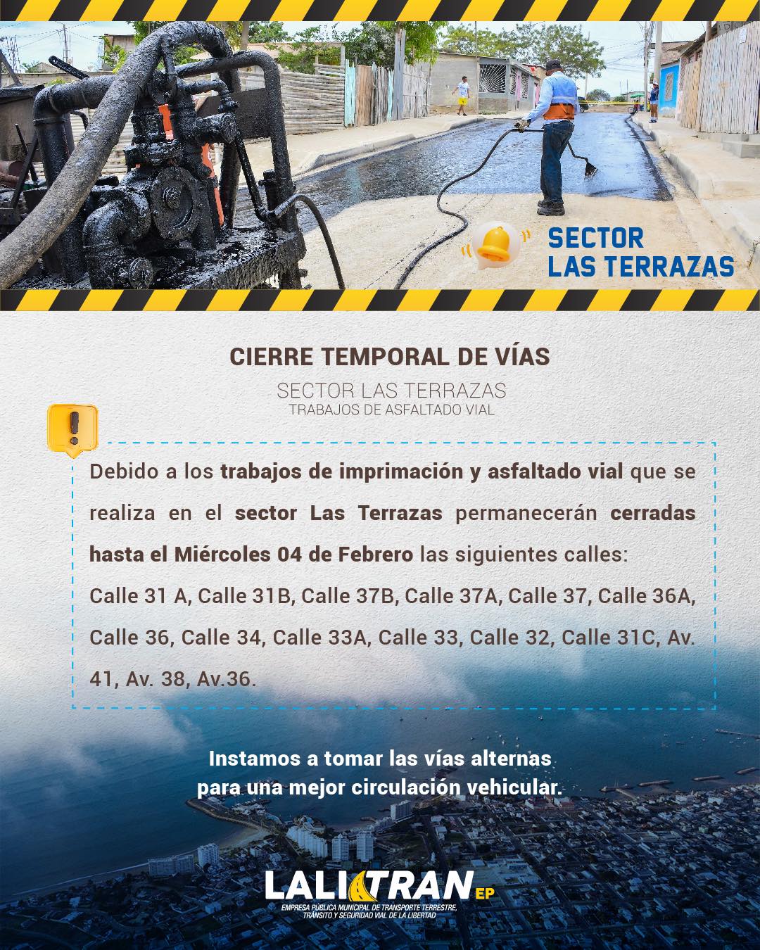Debido a los trabajos de imprimación y asfaltado vial que se realiza en el sector Las Terrazas permanecerán cerradas hasta el Miércoles 04 de Febrero las siguientes calles: Calle 31 A, Calle 31B, Calle 37B, Calle 37A, Calle 37, Calle 36A, Calle 36, Calle 34, Calle 33A, Calle 33, Calle 32, Calle 31C, Av. 41, Av. 38, Av.36.