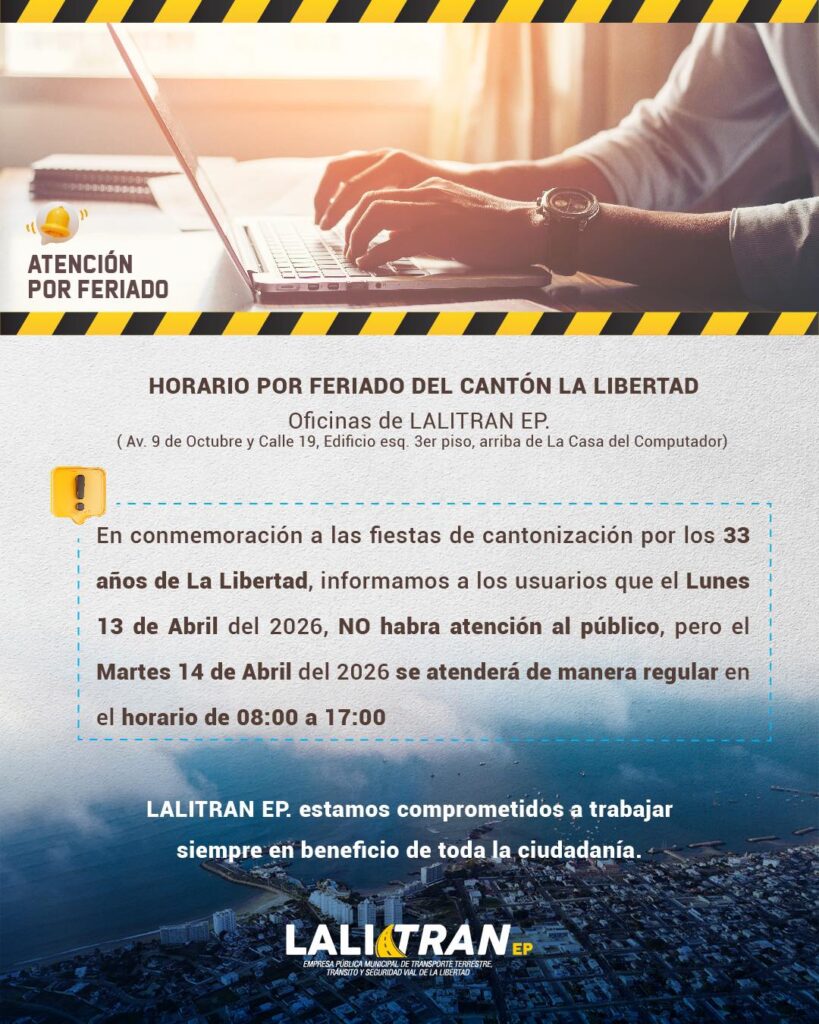 En conmemoración a las fiestas de cantonización por los 33 años de La Libertad, informamos a los usuarios que el Lunes 13 de Abril del 2026, NO habra atención al público, pero el Martes 14 de Abril del 2026 se atenderá de manera regular en el horario de 08:00 a 17:00.