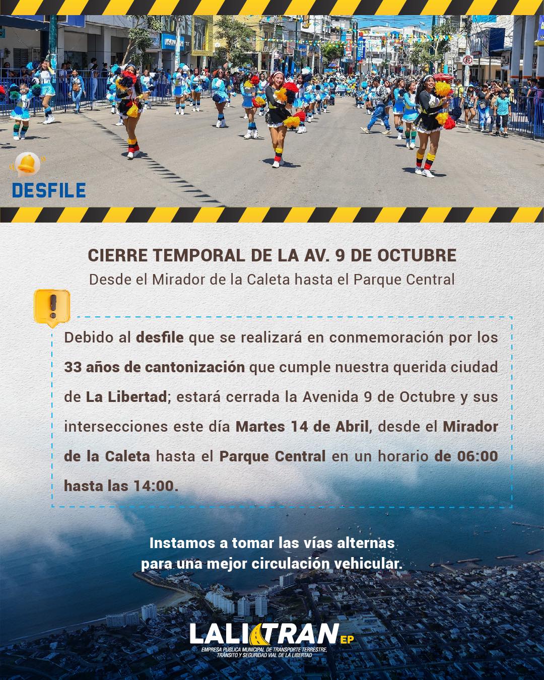 Debido al desfile que se realizará en conmemoración por los 33 años de cantonización que cumple nuestra querida ciudad de La Libertad; estara cerrada la Avenida 9 de Octubre y sus intersecciones este día Martes 14 de Abril, desde el Mirador de la Caleta hasta el Parque m Central en un horario de 06:00 hasta las 14:00.